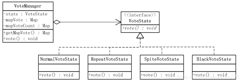 要使用状态模式实现,首先需要把投票过程的各种状态定义出来,根据以上描述大致分为四种状态:正常投票、反复投票、恶意刷票、进入黑名单。然后创建一个投票管理对象(相当于Context);